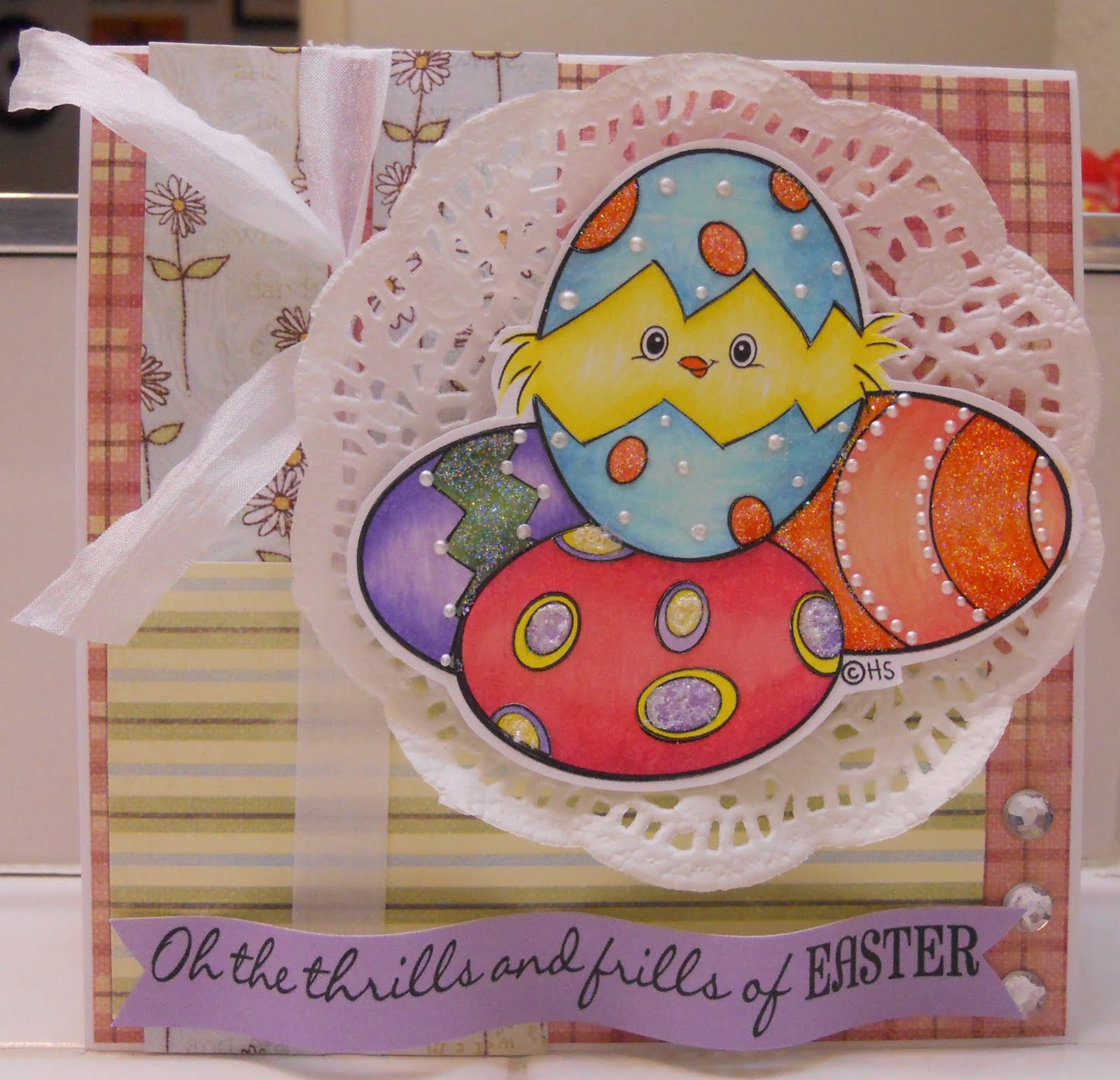 It's definately time to get our Easter groove on and with such cute Easter stamps at 2 Cute, how can you resist? I decided to color up Easter Egg Chickie! Now let me tell you this was the funnest stamp to work with, not only can you play with lots of blending techniques, but I couldn't resist blinging it out a litte! So get that bunny tail into gear!